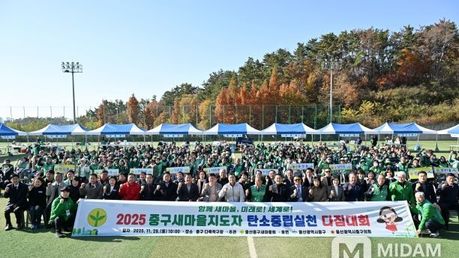 미담타임스 김준완 기자 | (사)울산중구새마을회(회장 정태식)가 11월 29일 오전 10시 중구 다목적구장에서 ‘2025 새마을지도자 탄소중립 실천다짐대회’를 개최했다. 이번 행사에는 김영길 중구청장과 박경흠 중구의회 의장, 박성민 국회의원, 시·구의원, 새마을지도자 등 600여 명이 함께했다. 이날 (사)울산중구새마을회는 새마을운동 활성화 및 지역사회 발전에 헌신한 유공자 36명에게 표창을 수여했다. 이어서 참석자들은 기후 위기 대응 및 탄소중립 실천을 위한 결의문을 낭독하고, 명랑 운동회 및 동(洞) 별 장기자랑 등을 즐기며 화합과 결속을 다졌다. 한편, (사)울산중구새마을회는 △사랑의 김장 나눔 △급식 지원 봉사활동 △환경정화 활동 등 지역사회를 위한 다양한 활동을 펼치고 있다. 정태식 (사)울산중구새마을회 회장은 “새마을지도자의 역량을 향상하고 화합을 도모하는 뜻깊은 시간이었다”며 “앞으로도 단합된 힘으로 지역 발전에 이바지하겠다”고 말했다. 김영길 중구청장은 “근면·자조·협동의 새마을정신을 바탕으로 다양한 봉사활동에 앞장서 주셔서 감사드린다”며 “앞으로도 함께 잘