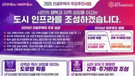 미담타임스 김준완 기자 | 울산시 건설주택국은 2026년 한 해를 ‘시민의 행복과 지역 성장을 이끄는 도시 기반(인프라) 조성의 해’로 정하고, 도로·주거·도시경관 전반에 걸쳐 정책 역량을 집중한다고 밝혔다. 특히 도시 경쟁력을 한 단계 끌어올려, 시민이 일상에서 체감할 수 있는 성과 창출에 속도를 낼 방침이다. 이를 위해 ▲지역 혁신 성장을 이끄는 도로망 확충 ▲시민 모두가 행복한 건축·주거환경 조성 ▲지역 활력을 높이는 도시경관 구현 ▲시민이 공감하는 안정적 정주여건 실현을 2026년 핵심 추진 방향으로 설정했다. 1. 지역 혁신 성장을 이끄는 도로망 확충 울산시는 정주 여건 개선과 지역 경쟁력 강화를 위해 도로망 확충을 최우선 과제로 추진한다. 특히 현 정부가 추진 중인 ‘국토 5극 3특 체계’에 발맞춰 ▲제3차 고속도로 건설계획(울산고속도로 도심 지하화 등 3개 사업) ▲제6차 국도·국지도 건설계획(언양~다운 국도 건설 등 2개 사업) ▲제5차 대도시권 교통혼잡도로 개선계획(문수로 우회도로 등 3개 사업)에 울산을 중심으로 한 광역 도로망 구축 사업이 반영될 수 있도록 중앙정부와
