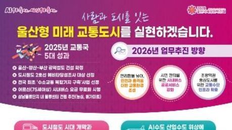 미담타임스 김준완 기자 | 울산시는 사람과 도시를 잇는 울산형 미래교통 도시 실현을 위해 2026년 교통 분야 정책 방향을 수립하고 추진에 나선다고 밝혔다. 2026년 교통 분야 정책 방향은 ‘사람과 도시를 잇는 울산형 미래교통도시 실현’을 목표로 △막히지 않는 일상, 초광역권 교통도시 구축 △울산사람이 자부심을 느낄 수 있는 교통 환경 조성에 주력한다. 이를 위해 ▲도시철도와 광역철도망 구축 ▲울산공항 활성화 ▲교통복지 정책 추진 ▲교통기반(인프라) 구축 등 4개 추진 전략과 18개 과제를 중점 추진할 계획이다. 주요 세부 내용은 다음과 같다. 첫째, 도시철도와 광역철도망 구축을 위해 ▲세계 최초 수소 트램 1호선 및 2호선 건설 ▲울산권 광역철도(울산~양산~부산, 동남권순환) 건설 ▲태화강역 고속철도(케이티엑스(KTX)-산천, 에스알티(SRT)) 정차 추진 ▲북울산역 광역철도 연장 운행 등을 추진한다. 트램 1호선(태화강역~신복교차로, 10.85㎞)은 오는 2029년 개통을 목표로 올해 하반기부터 본격적으로 착공에 들어가며, 2호선(북울산역~야음사거리, 13.55㎞)은 올해 기재부