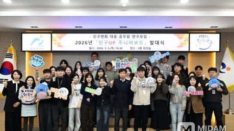 미담타임스 김준완 기자 | 울산 남구(구청장 서동욱)는 5일 남구청 3층 회의실에서 공무원 정책연구모임 ‘인구UP 주니어보드’ 발대식을 개최하고 인구 변화 대응을 위한 2026년 연구 활동을 본격적으로 추진한다. ‘인구UP 주니어보드’는 남구청 전 직원을 대상으로 운영하는 연구모임으로 임신·출산보육, 청년·노인 복지, 생활인구 유입 등 인구정책 전 분야를 대상으로 실효성 있는 정책을 발굴·검토하는 것을 목표로 한다. 이날 행사는 공무원 연구모임 6개 팀(30명)이 참석한 가운데 사업 안내, 팀 소개 및 팀별 연구계획 공유, 질의응답 순으로 진행됐다. 참여자들은 실효성 있는 주제별 정책 제안 도출을 목표로 8개월간 연구 활동에 들어가 연구과제 담당 부서와의 멘토링, 정책자문단의 자문 등을 반영해 과제를 면밀히 검토한 후, 오는 10월 최종 연구 성과를 발표할 계획이다. 앞서 지난해 ‘인구UP주니어보드’에는 4개 팀, 20명의 직원이 참여해 연구를 진행했고 그 결과 총 22건의 인구정책 제안을 도출하는 성과를 거뒀다. 특히 최우수팀으로 선정된 ‘청바지’팀은 청년의 결혼·임신·출산·육아 전