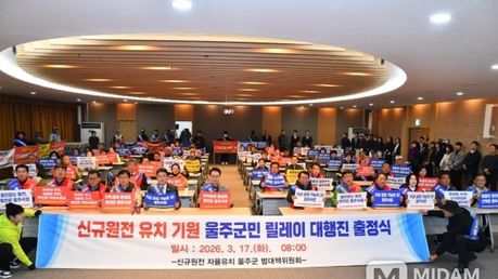 미담타임스 김준완 기자 | 울산 울주군이 17일 ‘신규 원전 유치 기원 울주군민 릴레이 대행진’을 행사를 열고, 한국수력원자력에 원자력발전소 건설 후보부지 유치신청서를 공식 제출했다. 이번 행사는 울주군 신규 원전 유치에 대한 울주군민의 뜻과 참여 의지를 대외적으로 표명하고, 자율적이고 평화적인 방식으로 지역의 염원을 전달하기 위해 마련됐다. 이날 이순걸 군수와 서범수 국회의원, 울주군의회 최길영 의장 및 시군의원, 범대책위원회, 주민 등 70여명은 군청 문수홀에서 출정식을 개최한 뒤 릴레이 행진에 나섰다. 참석자들은 울주군청에서 한국수력원자력 본사까지 총 47.5㎞를 5개 구간으로 나눠 도보로 이동했다. 마지막 한수원 본사에는 모든 참석자가 모인 가운데 울주군 원자력발전소 건설 후보부지 유치신청서와 유치에 동의하는 주민 3만3천명의 서명이 담긴 주민서명지를 제출했다. 이순걸 울주군수는 “신규 원전 유치 기원 울주군민 릴레이 대행진이 신규 원전 유치에 대한 지역사회의 의지와 공감대를 보여주는 계기가 될 것으로 기대한다”며 “앞으로도 울주군은 군민과의 소통을 바탕으로 신규 원전 유치와 관련한 절차를