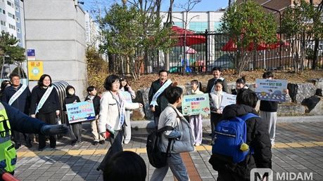 미담타임스 김준완 기자 | 울산 북구는 19일 개학기를 맞아 명촌초등학교 등굣길에서 '아이 먼저' 교통안전 캠페인을 실시했다. 이날 캠페인에는 북구청과 명촌초 관계자, 모범운전자회 등 30여 명이 참여해 어린이보호구역 내 운전자의 교통법규 준수와 안전 운전 인식 개선을 위한 홍보활동을 펼쳤다. 북구는 안전한 학교 환경 조성을 위해 지속적인 캠페인과 함께 어린이보호구역 66곳의 교통안전시설물을 정비하고 시인성을 강화하는 등 안전한 보행환경 조성사업도 추진하고 있다. 북구 관계자는 "안전한 학교 환경 조성을 위해서는 운전자 및 주민들의 관심이 필요하다"며 "지속적인 홍보와 시설 정비를 통해 어린이가 안전한 환경을 만들어 가도록 하겠다"고 말했다.