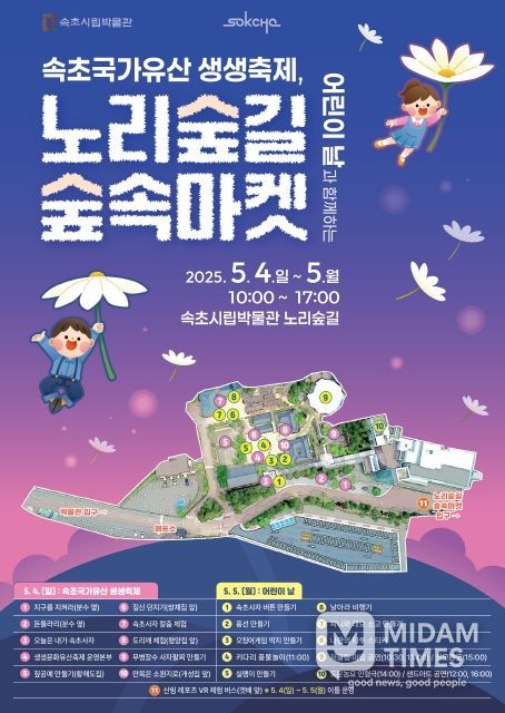 4일부터 5일까지는 ‘속초 국가유산 생생축제’와 어린이날 맞이 창의 체험, 공연이 연달아 이어지며, 이틀간 노리숲길 숲속마켓도 함께 개최되어 방문객에게 다채로운 체험과 공연을 선사한다.
