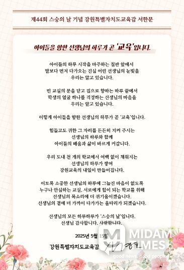 미담타임스 정인화 기자 | 신경호 강원특별자치도교육감은 제44회 스승의 날을 맞아 도내 모든 교원에게 존경과 감사의 마음을 담은 서한문을 전달했다.