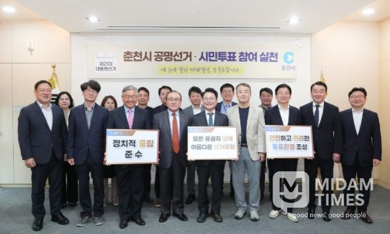 미담타임스 정인화 기자 | 육동한 춘천시장과 시청 국과장, 산하 공공기관장들이 15일 시청 접견실에서 제21대 대통령 선거에 앞서 공무원의 정치적 중립 실천과 유권자들의 투표참여