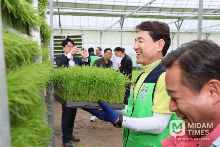 육묘 작업을 마친 뒤, 김 지사는 인근 논으로 이동해 직접 이앙기에 올라 벼를 심는 등 모내기 작업에도 참여했다.