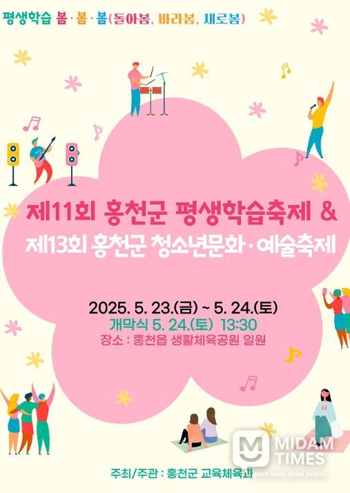 미담타임스 정인화 기자 | 홍천군은 오는 23일부터 24일까지 ‘평생 학습 봄‧봄‧봄(돌아봄, 바라봄, 새로봄)’이라는 주제로 홍천읍 생활체육공원 일원에서 제11회 홍천군 평생 학습 축제, 제13회 홍천군 청소년문화·예술축제를 함께 개최한다고 밝혔다.