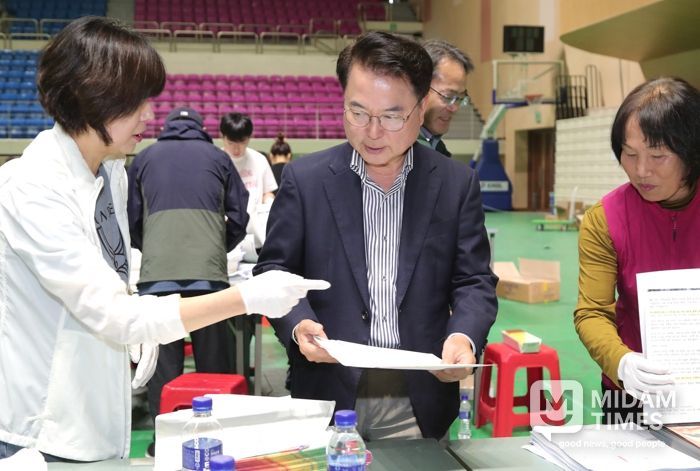 미담타임스 정인화 기자 | 육동한 춘천시장이 24일 호반체육관을 찾아 21대 대통령선거 공보물 발송작업 현장을 점검했다.