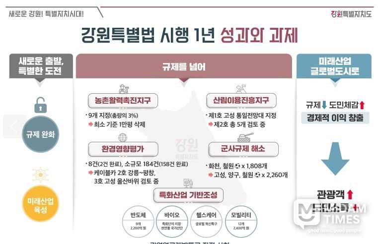 미담타임스 정인화 기자 | 강원특별자치도는 '강원특별법' 전부개정 법률 시행(‘24.6.8.) 1년을 맞아 강원자치도만의 특례를 활용한 주요 성과와 향후계획을 발표했다.