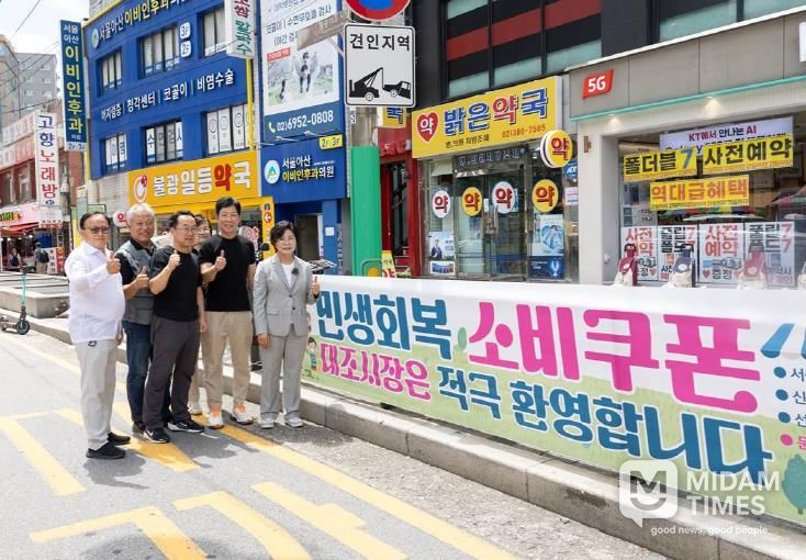 김미경 구청장은 참석자들과 함께 소비 장려 캠페인도 펼쳐 지역경제 살리기에 대한 실천 의지를 밝혔으며, 이후 인근 전통시장을 찾아 의류 등을 직접 구매 하며 골목상권에 활기를 불어넣는 현장 중심 활동을 이어갔다.