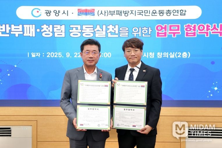 미담타임스 정인화 기자 | 광양시는 9월 22일 시청 창의실에서 (사)부패방지국민운동총연합과 반부패 청렴 공동실천을 위한 업무협약을 체결했다고 밝혔다.