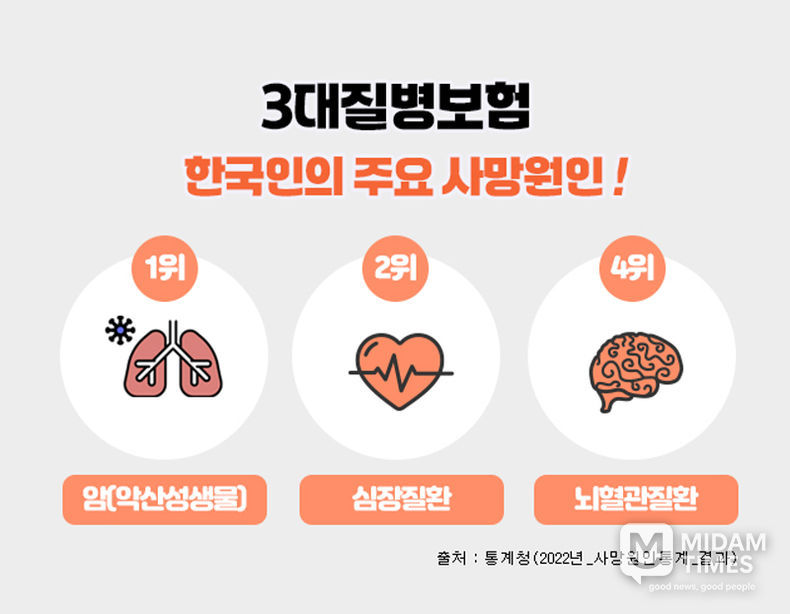 미담타임스 김준완 기자 | 3대질병으로 일컬어지는 암, 뇌혈관질환, 심혈관질환은 한국인의 주요 사망원인에서 상위를 차지하고 있으며, 이에 대한 진단비를 집중적으로 보장해 주는 보험상품을 3대질병진단비 보험이라 할 수 있다.