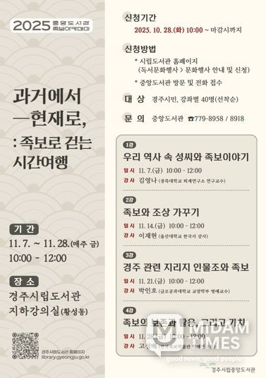 미담타임스 김준완 기자 | 경주시립중앙도서관은 오는 11월 7일부터 12월 5일까지 매주 금요일 오전 10시, 경주시립도서관 지하 강의실에서 ‘2025 족보아카데미 : 과거에서 현재로, 족보로 걷는 시간여행’을 운영한다.