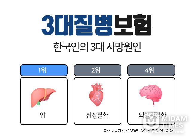미담타임스 김준완 기자 | 흔히 3대질병이라 일컫는 암, 심혈관질환, 뇌혈관질환은 통계청 발표자료에 따르면 한국인의 주요 사망원인 중에서 3위 폐렴을 제외하고 1~4위를 차지하고 있으며, 이전부터 지금까지도 살면서 가장 먼저 대비해야 하는 치명적인 질병으로 강조되고 있다. 이러한 중대질병에 대비하기 위하여 상기 세가지 치명적인 질병을 집중보장하는 3대질병진단비보험을 많이 가입하고 있다. 3대진단비보험은 각각의 질병을 중점적으로 보장하면서도 가입자 특성에 맞는 특약을 추가함으로써 종합건강보험으로도 활용할 수가 있다.