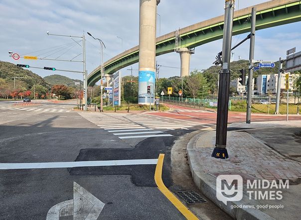 구체적으로 신호등과 가로등을 이설하고, 가각부에 있는 보도를 약 1m 축소함으로써, 버스 차량이 진입하는 데 불편함이 없도록 조치했다.