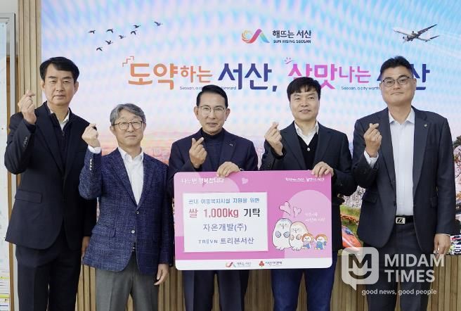 미담타임스 정인화 기자 | 충남 서산시는 5일 시청 시장실에서 자온개발㈜·트리븐 서산의 이웃돕기 쌀 기탁식을 개최했다고 밝혔다.
