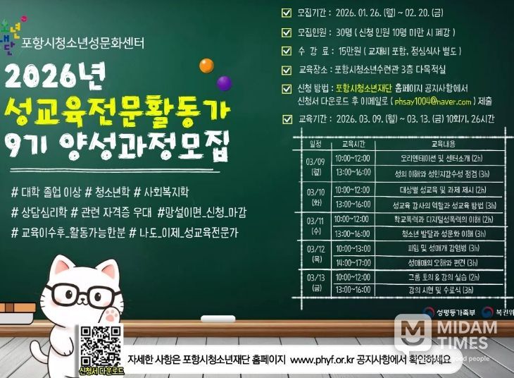 미담타임스 김준완 기자 | 포항시청소년재단 청소년성문화센터는 오는 26일부터 내달 20일까지 청소년들의 건강한 성장을 돕고 올바른 성가치관을 전파할 ‘2026년 제9기 청소년 성교육 전문활동가 양성과정’ 교육생 30명을 모집한다.