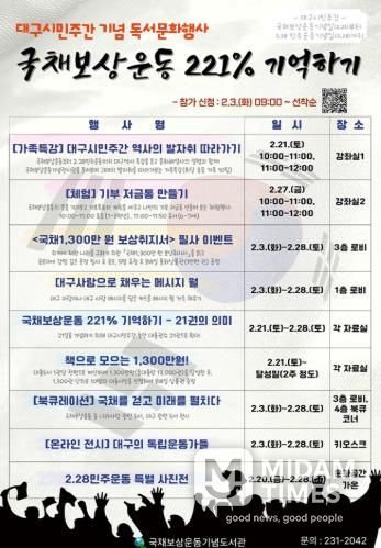 미담타임스 김교환 기자 | 대구시교육청 산하 국채보상운동기념도서관은 대구시민주간(2월 21일 ~ 28일)을 맞아 대구사랑과 나라사랑의 의미를 되새기기 위한 대구시민주간 기념 행사를 운영한다.
