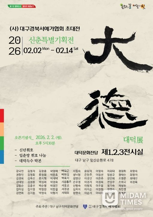 미담타임스 김교환 기자 | 대구 남구 대덕문화전당이 진한 묵향과 함께 전통의 서예 정신을 만끽할 수 있는 그룹전 '대덕전(大德展)'을 2026년 신춘특별기획 전시로 개최한다.