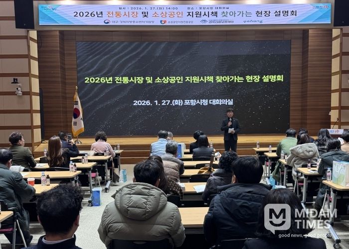 미담타임스 김준완 기자 | 포항시는 27일 시청 대회의실에서 대구경북지방중소벤처기업청 주관으로 ‘2026년 전통시장·소상공인 찾아가는 현장설명회’를 개최하며 지역 상인들의 정책 접근성 강화에 나섰다.