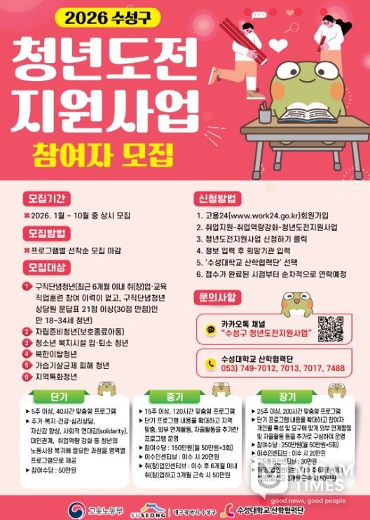 미담타임스 김교환 기자 | 대구 수성구는 구직에 어려움을 겪는 청년을 대상으로 2026년도 ‘청년도전 지원사업’ 참여자 130명을 모집한다고 밝혔다.