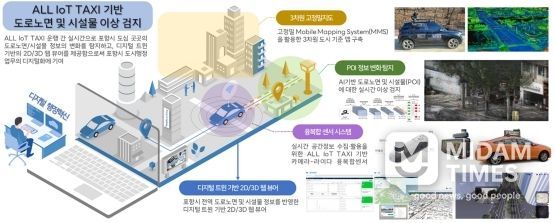 교통량이 많은 택시와 관용차량 지붕에 IoT 센서와 카메라를 설치해, 차량이 도로를 주행하는 과정에서 포트홀(도로 파임), 차선 훼손, 불법 적치물, 어린이보호구역 내 불법 주정차 등을 자동으로 감지한다.