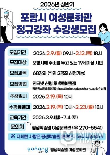 미담타임스 김준완 기자 | 포항시 평생학습원 여성문화관은 ‘2026년 상반기 정규강좌’ 수강생을 모집한다.