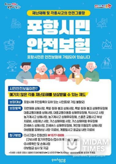 미담타임스 김준완 기자 | 포항시는 각종 재난과 일상생활 사고로부터 시민 안전을 지키기 위해 2026년도 시민안전보험을 갱신가입하고, 지난해 대비 보장 항목을 확대해 운영한다.