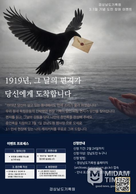 미담타임스 김교환 기자 | 경상남도기록원은 제107주년 3·1절을 앞두고 체험형 기록 이벤트 ‘1919년, 그날의 편지가 당신에게 도착합니다’를 운영하고, 2월 한 달간 참여 접수를 진행한다.