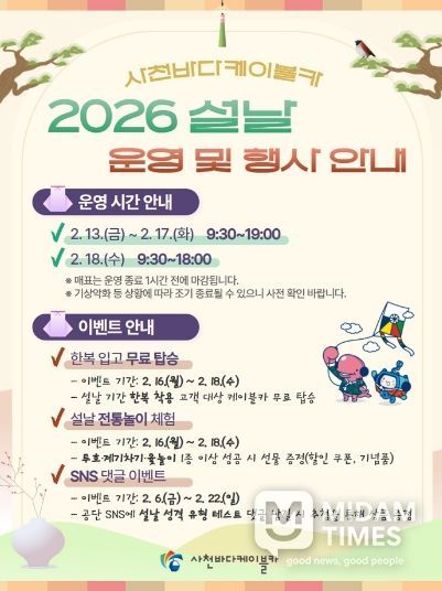 미담타임스 김교환 기자 | 사천시시설관리공단이 설 명절을 맞아 사천바다케이블카에서 온·오프라인 행사를 동시에 마련했다. 연휴 기간 운영시간 연장을 비롯해 한복 무료 탑승, 전통놀이 체험, SNS 이벤트까지 방문객이 직접 참여할 수 있는 다양한 프로그램을 준비했다.
