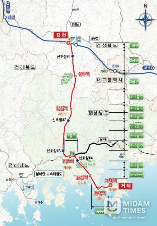 남부내륙철도는 현재 전체 14개 공구 중 10개 공구에 대해 시공 계약을 완료했다. 10공구는 기본설계 기술제안 방식으로 추진 중이며, 나머지 3개 공구(1·7·9공구)는 상반기 중 실시설계 기술제안 방식으로 공고될 예정이다.