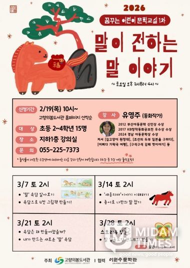 1차 강의는 3월 7일부터 4주간 매주 토요일 오후 2시에 진행되며, ‘말의 해’를 맞이해 ‘말’을 주제로 한 독서·창작 활동과 스토리쿠킹 체험이 함께 이루어진다. 수강생 모집은 2월 19일 오전 10시부터 고향의봄도서관 누리집에서 온라인 선착순으로 진행된다. 자세한 사항은 도서관 누리집을 참고하거나 고향의봄도서관팀으로 문의하면 된다.