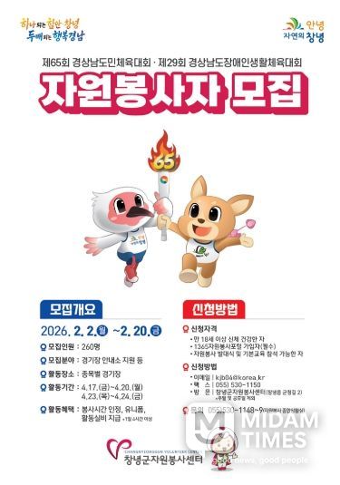 미담타임스 김교환 기자 | 창녕군은 오는 4월 17일부터 20일까지 열리는 제65회 경상남도민체육대회와 4월 23일, 24일 진행되는 제29회 경상남도장애인생활체육대회의 성공적인 개최를 위해 자원봉사자 260명을 모집한다.