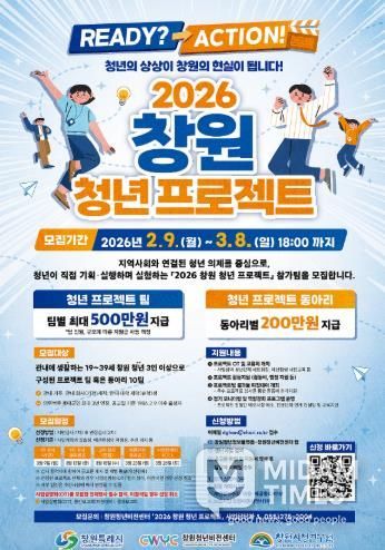 미담타임스 김교환 기자 | 창원특례시는 지역 청년들이 사회 의제를 직접 발굴하고 해결하는 과정을 지원하기 위한 창원청년비전센터 ‘2026년 창원 청년 프로젝트’ 참가 팀을 2월 9일부터 3월 8일까지 모집한다고 밝혔다.