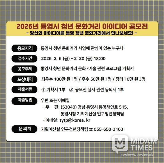 미담타임스 김교환 기자 | 통영시는 '청년 365 핫플레이스 조성사업'과 연계한 청년 문화·예술 프로그램을 발굴하기 위해 ‘2026년 통영시 청년 문화거리 아이디어 공모전’을 개최한다고 9일 밝혔다.