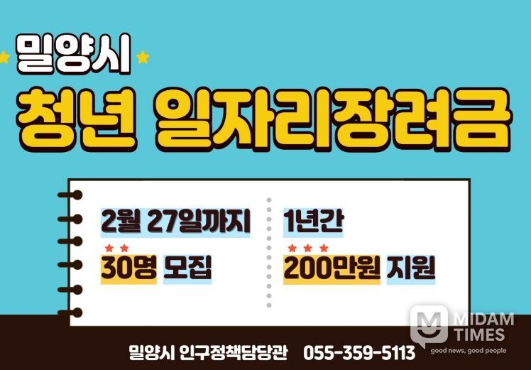 미담타임스 김교환 기자 | 경남 밀양시는 취업 초기 청년들의 안정적인 지역 정착을 지원하기 위해 오는 27일까지 ‘2026년 청년 일자리 장려금’ 지원 대상자 30명을 모집한다.