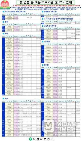 미담타임스 김교환 기자 | 사천시는 설 연휴 기간인 2월 14일부터 18일까지 5일간 시민들이 안전하고 건강한 명절을 보낼 수 있도록 '응급진료 상황실'을 운영하며 비상진료체계를 본격 가동한다고 11일 밝혔다.