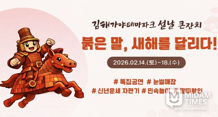 미담타임스 김교환 기자 | (재)김해문화관광재단이 운영하는 김해가야테마파크가 오는 2월 14일부터 18일까지 설날 특집 행사 ‘붉은 말, 새해를 달리다’를 개최한다.