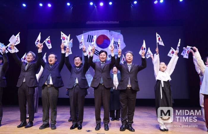 독립정신을 기리는 이번 기념식은 진스태권도 공연단의 기품 있는 태권도 시범과 퓨전 국악팀 ‘윤슬’의 전통적 색채를 담은 식전 공연으로 막을 올렸다. 이어 누베스어린이합창단이 애국가와 ‘대한독립만세’ 동요, 3·1절 노래를 합창해 경건한 분위기를 더했다.
