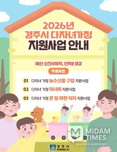 미담타임스 김준완 기자 | 경주시는 다자녀 가정의 경제적 부담을 실질적으로 완화하고 안정적인 정주 기반을 강화하기 위해 ‘2026년 경주시 다자녀 가정 지원사업’을 3월부터 본격 시행한다고 밝혔다.