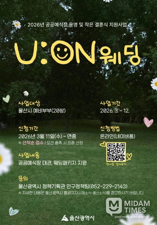 울산시는 공공예식장 대관과 작은 결혼식 운영을 지원하는 ‘유온(U:ON) 결혼(웨딩)’ 사업을 본격 추진하고 오는 3월 11일부터 참여 대상자를 모집한다고 밝혔다.