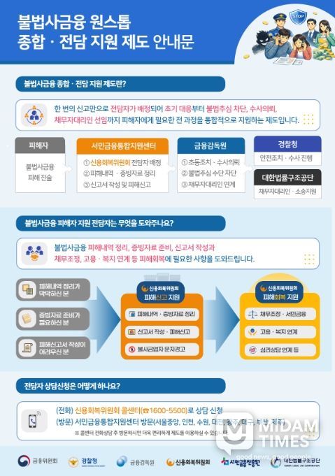 이에, 정부는 8개 권역의 서민금융통합지원센터에 신복위 불법사금융 전담자(17명)를 배치하여, 불법사금융 피해자가 안전하고 편리하게 종합적인 지원을 받도록 조력하는 업무만을 수행토록 했다. 전담자는 피해내역 확인 및 피해신고 절차 제반 지원부터 불법사금융업자에게 즉시 추심 중단 경고, 피해구제·지원 절차 진행상황 확인, 사회 복귀를 위한 채무조정, 고용·복지 지원 연계까지 피해자가 이용가능한 모든 정부·유관기관 서비스를 원스톱으로 지원하게 된다.