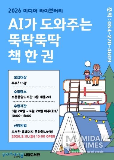 미담타임스 김준완 기자 | 포항시립포은중앙도서관은 오는 24일부터 4월 28일까지 매주 화요일, 포은중앙도서관 배움2터에서 ‘2026 상반기 별찌인문교실’과 ‘미디어라이브러리’ 수업을 운영한다.
