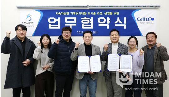 미담타임스 김준완 기자 | 인천시설공단 청라공원사업단이 지난 10일, 한국서부발전 사내벤처 ㈜셀바이오(대표이사 변형완)와 함께 업무협약을 체결하고 민관 협력을 통한 도시숲 조성과 공원 관리 효율화에 나선다.