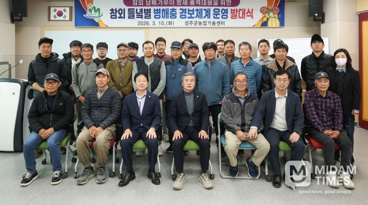 미담타임스 김준완 기자 | 성주군은 최근 이상고온으로 급증하는 담배가루이 등 병해충 피해를 최소화하기 위해 3월 10일, 8개 권역 30명의 모니터링 요원을 위촉하는 발대식을 갖고'참외 들녘별 병해충 경보 체계'운영에 본격 돌입했다.