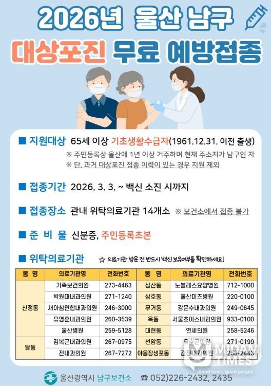 미담타임스 김준완 기자 | 울산 남구보건소는 65세 이상(1961. 12. 31. 이전 출생자) 기초생활수급자를 대상으로 대상포진 무료 예방접종 사업을 이달부터 시행 중이라고 밝혔다.