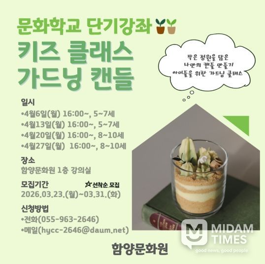 미담타임스 황명수 기자 | 함양문화원(원장 정상기)은 군민들에게 문화예술 체험 기회를 제공하기 위해 오는 4월 단기강좌 '글라스아트 클래스'와 '키즈 캔들 클래스'를 운영한다.