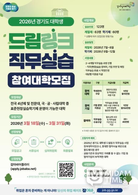 미담타임스 정주환 기자 | 경기도와 경기도일자리재단이 ‘경기도 대학생 드림링크 직무실습’ 사업에 참여할 15개 협력대학을 31일까지 모집한다.