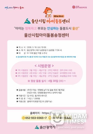 한편 울산시는 공공 돌봄 수요 증가에 대응하기 위해 거점형 시립아이돌봄센터 확충을 지속적으로 추진하고 있다.