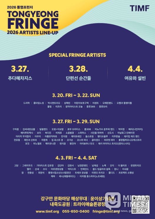 미담타임스 황명수 기자 | 통영시는 오는 3월 20일부터 4월 4일까지 통영시 일원에서 개최되는 '2026 통영프린지'의 개막을 앞두고, 축제에 참여하는 주요 라인업과 공간별 관람 포인트를 공개했다.